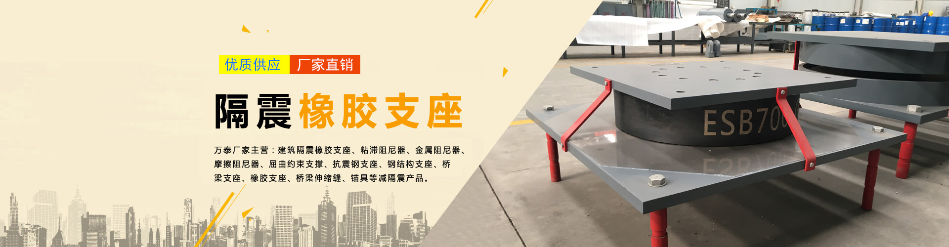 我公司專業(yè)設(shè)計(jì)、生產(chǎn)、銷售建筑橋梁減隔震產(chǎn)品。隔震產(chǎn)品主要有:隔震橡膠支座、鉛芯橡膠支座、抗拉裝置、抗風(fēng)裝置;減震產(chǎn)品主要有:屈曲約束支撐、剪切型金屬阻尼器、摩擦阻尼器、連梁阻尼器、粘滯阻尼器、粘滯阻尼墻、粘彈阻尼器;機(jī)電抗震產(chǎn)品主要有:設(shè)備隔震支座、設(shè)備減震墊板;網(wǎng)架及鋼結(jié)構(gòu)支座系列產(chǎn)品主要有:網(wǎng)架橡膠支座、球型鋼支座、球鉸支座、減震鋼支座、網(wǎng)架抗拉支座;橋梁支座產(chǎn)品主要有:盆式支座、球型支座、橡膠支座、摩擦擺式支座、高阻尼隔震支座、水平分散力支座、鉛芯隔震支座、防落梁裝置、抗震擋塊;橋梁伸縮裝置系列產(chǎn)品主要有:模數(shù)式伸縮裝置、梳齒板型伸縮裝置、多向變位式伸縮裝置。
